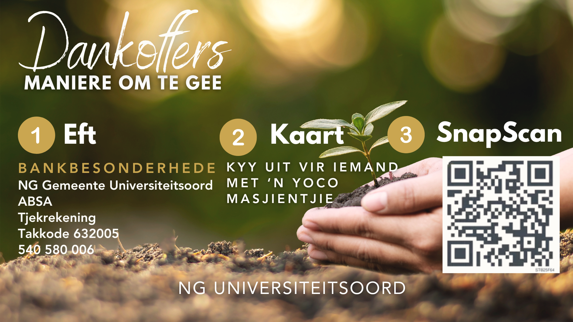 Skandeer die meegaande QR-kode en maak 'n keuse (Dankfees, Oggend/aanddiens, ens). Vul 'n bedrag in en stuur 'n e-pos aan kantoor@universiteitsoord.co.za